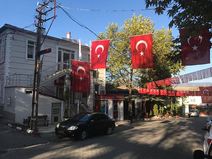 Bilecik'in İnhisar ilçesinde aklı dengesi yerinden olmayan bir şahıs tarafından yakılan 3 Türk bayrağı sonrası ilçe Türk Bayrakları ile donatıldı. Bayrakları yakılan 3 kahveci yerlerine yenilerini astılar.
