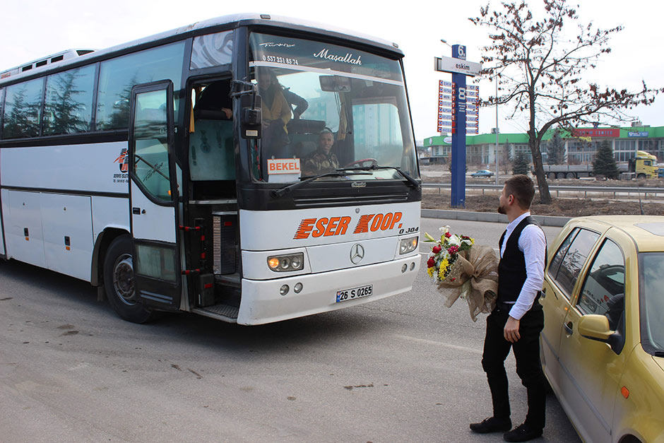 Eskişehir'de bir fabrikada çalışan Fatih Şentarla, kendisi gibi işçi emekçisi olan sevgilisine, işçi servisinin önünü keserek evlenme teklifinde bulundu.