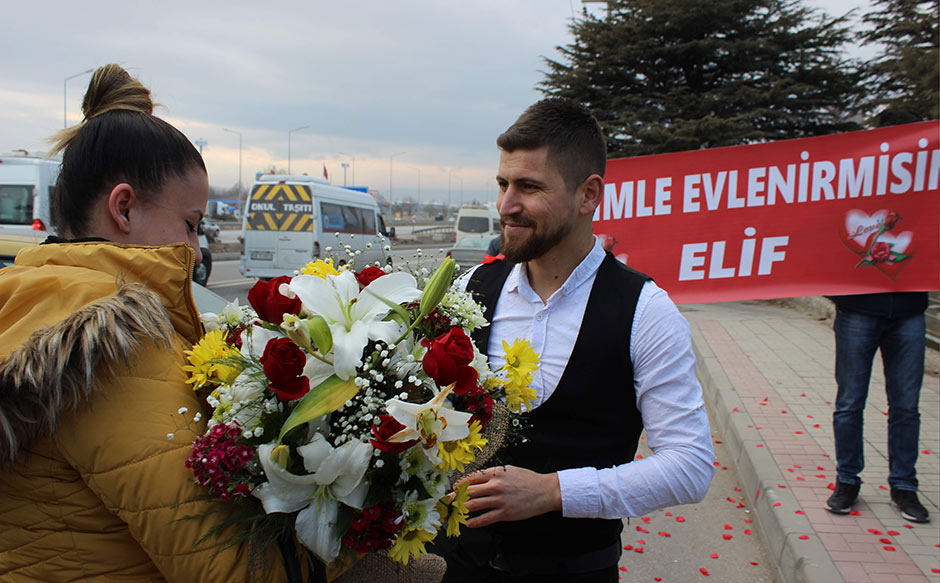 Eskişehir'de bir fabrikada çalışan Fatih Şentarla, kendisi gibi işçi emekçisi olan sevgilisine, işçi servisinin önünü keserek evlenme teklifinde bulundu.