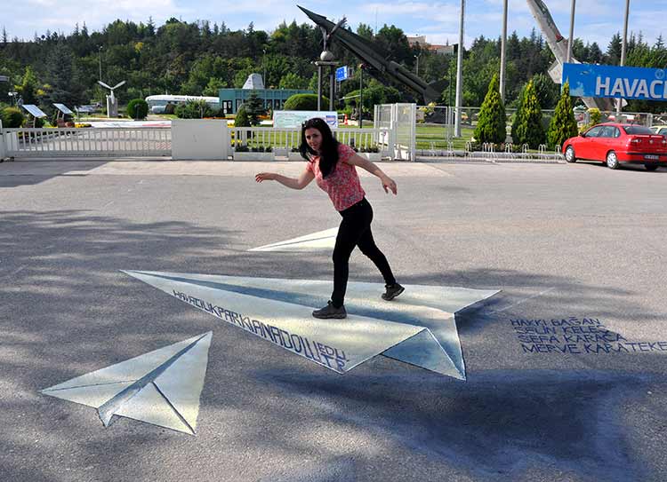 Eskişehir'de, Anadolu Üniversitesi (AÜ) Güzel Sanatlar Fakültesi öğrencileri Sefa Karaca, Selin Keleş ile Merve Karateke dünyaca ünlü sokak resmi sanatçısı Alex Maksiov'u örnek alarak AÜ Havacılık Parkı'na "kağıt" uçakların 3 boyutlu resimlerini çizdi.