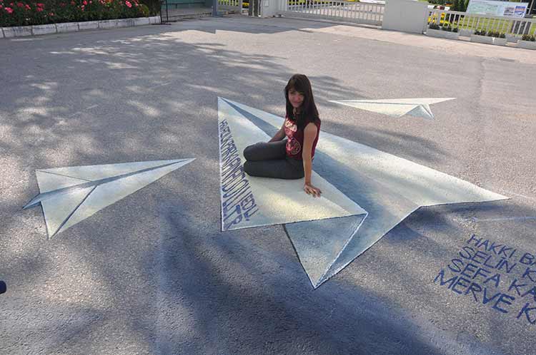Eskişehir'de, Anadolu Üniversitesi (AÜ) Güzel Sanatlar Fakültesi öğrencileri Sefa Karaca, Selin Keleş ile Merve Karateke dünyaca ünlü sokak resmi sanatçısı Alex Maksiov'u örnek alarak AÜ Havacılık Parkı'na "kağıt" uçakların 3 boyutlu resimlerini çizdi.