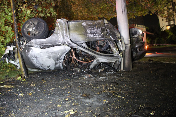 Konya'da refüjdeki ağaçlar ile aydınlatma direğine çarptıktan sonra alev alan otomobildeki 3 kişi öldü, 2 kişi yaralandı.