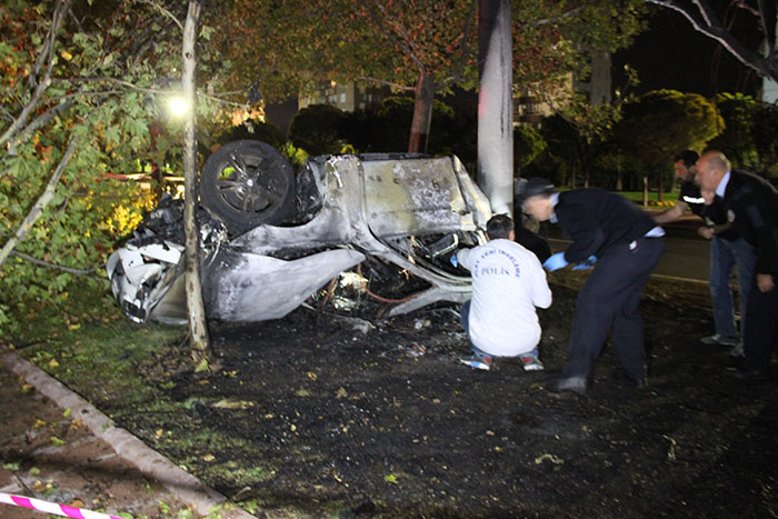 Konya'da refüjdeki ağaçlar ile aydınlatma direğine çarptıktan sonra alev alan otomobildeki 3 kişi öldü, 2 kişi yaralandı.