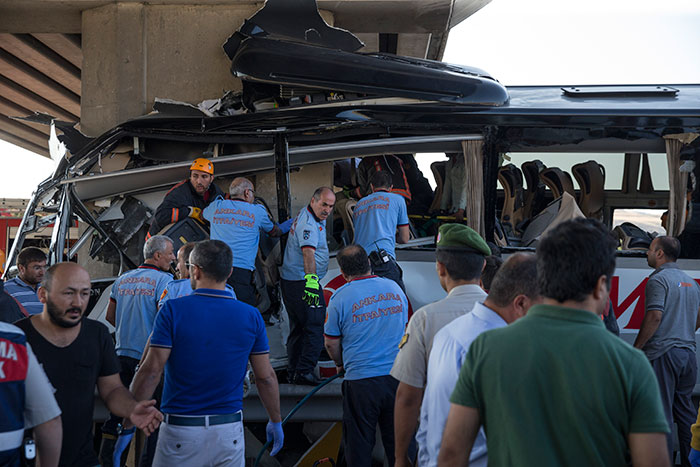 Eskişehir-Ankara karayolunda yolcu otobüsünün köprü ayağına çarpması sonucu ilk belirlemelere göre 5 kişi öldü, çok sayıda kişi yaralandı.İzmir'den Ankara'ya gelen Uğur Durmaz'ın kullandığı 53 DJ 338 plakalı yolcu otobüsü, Ankara'ya 35 kilometre kala Ballıkuyumcu mevkisinde kontrolden çıkarak köprü ayağına çarptı. Kazada ilk belirlemelere göre 5 kişi yaşamını yitirdi, çok sayıda kişi yaralandı. Kazayı haber alan bazı yolcu yakınları olay yerine gelerek bilgi almaya çalışırken gözyaşları içinde kurtarma çalışmalarını izledi.