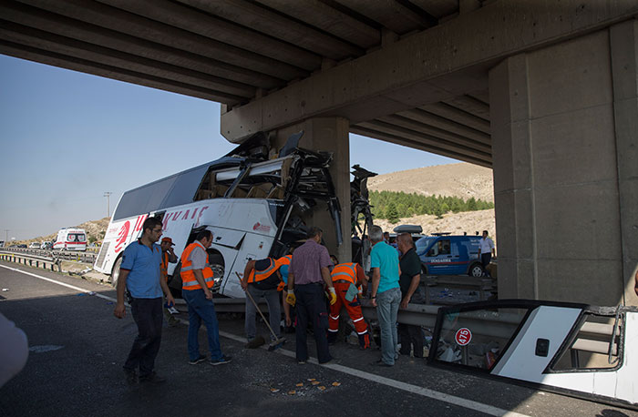 Eskişehir-Ankara karayolunda yolcu otobüsünün köprü ayağına çarpması sonucu ilk belirlemelere göre 5 kişi öldü, çok sayıda kişi yaralandı.İzmir'den Ankara'ya gelen Uğur Durmaz'ın kullandığı 53 DJ 338 plakalı yolcu otobüsü, Ankara'ya 35 kilometre kala Ballıkuyumcu mevkisinde kontrolden çıkarak köprü ayağına çarptı. Kazada ilk belirlemelere göre 5 kişi yaşamını yitirdi, çok sayıda kişi yaralandı. Kazayı haber alan bazı yolcu yakınları olay yerine gelerek bilgi almaya çalışırken gözyaşları içinde kurtarma çalışmalarını izledi.