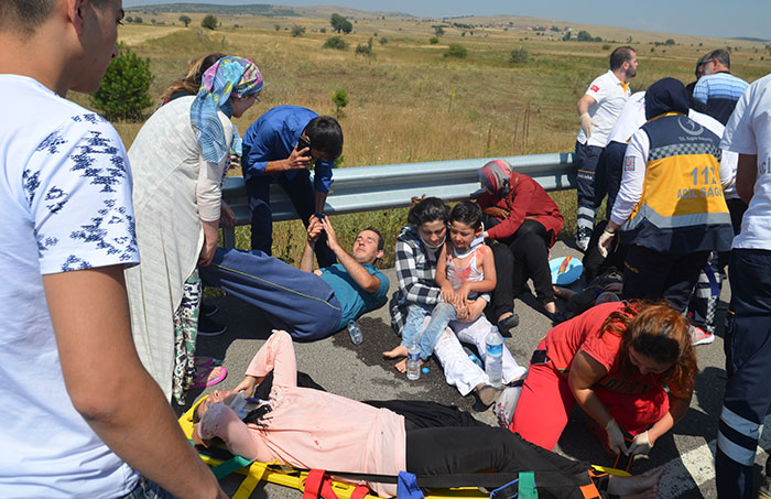 Kütahya'da, seyir halindeyken devrilen kamyondaki tomrukların bir otomobilin üzerine düşmesi sonucu 4'ü ağır 8 kişi yaralandı.