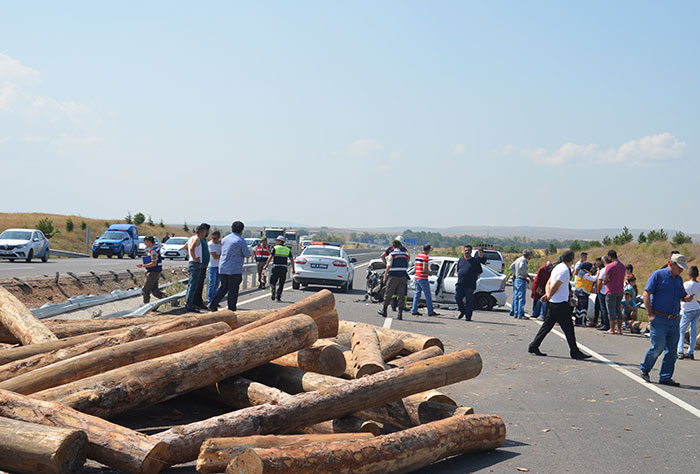 Kütahya'da, seyir halindeyken devrilen kamyondaki tomrukların bir otomobilin üzerine düşmesi sonucu 4'ü ağır 8 kişi yaralandı.