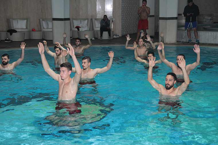 Eskişehirsporlu oyuncular, Antalya Belek'te yaptıkları kampın 7. gününde havuzda kuvvet çalışması yaptı.