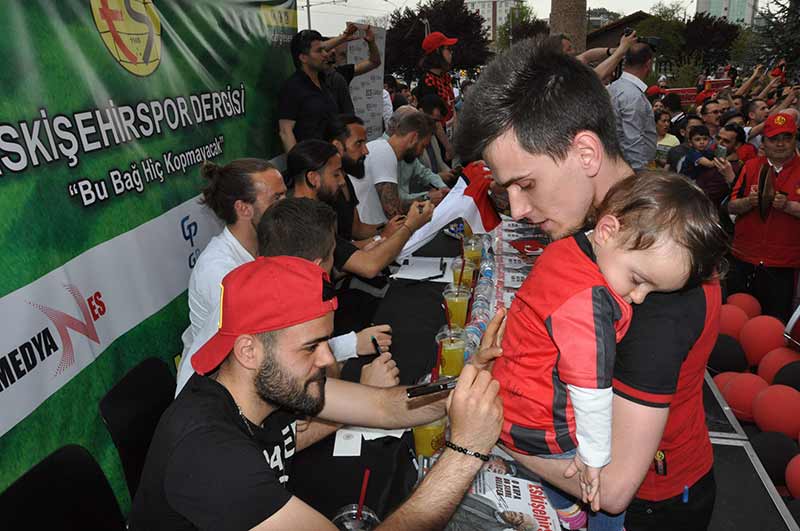 TFF 1. Lig ekiplerinden Eskişehirspor'un teknik direktörü Mustafa Denizli ve futbolcular, Eskişehirspor dergisini imzaladı, taraftarlarla hatıra fotoğrafı çektirdi.