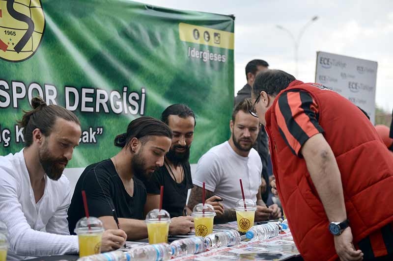 TFF 1. Lig ekiplerinden Eskişehirspor'un teknik direktörü Mustafa Denizli ve futbolcular, Eskişehirspor dergisini imzaladı, taraftarlarla hatıra fotoğrafı çektirdi.