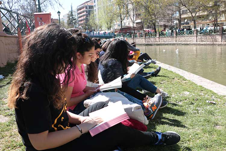 Eskişehir’de sosyal medya üzerinde örgütlenen onlarca kişi, Porsuk Çayı kenarında kitap okuyarak güzel ve güneşli havanın keyfini çıkardı.