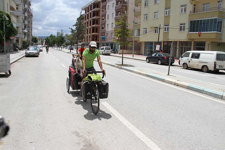 Çektikleri banka kredisi ile köpekleri Eska ile birlikte “2 Pedal, 4 Pati” sloganıyla Türkiye turuna çıkan iki bisikletsever, Konya'nın Beyşehir ilçesinde mola verdi.