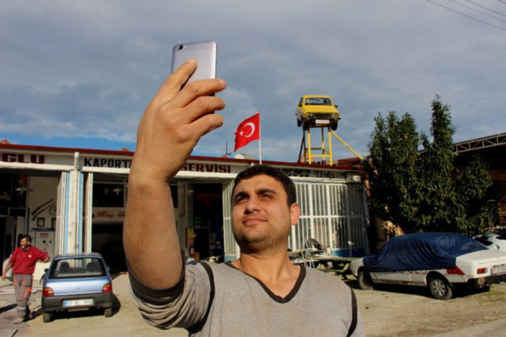 Karadenizli kaportacı yaptı, gören dönüp bir daha bakıyor. Bir kaporta ustasının iş yerinin çatısına koyduğu otomobil, uzaktan bakınca ''uçan araba'' sanılıyor.