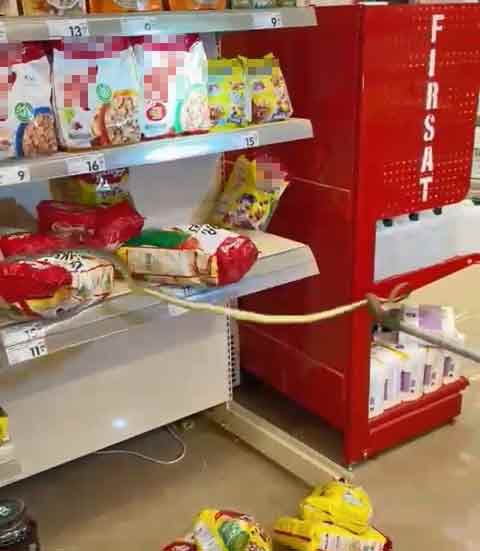 Yılanı görünce vatandaşlar panik içinde dışarı çıkarken, market görevlileri durumu itfaiye ekiplerine bildirdi.