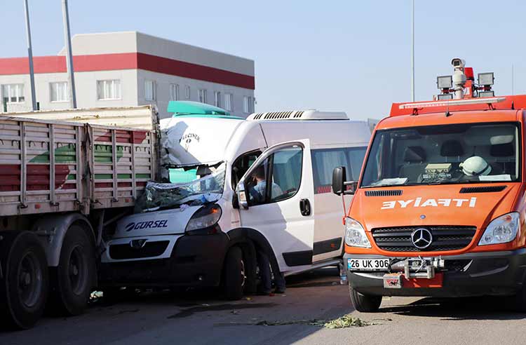 Eskişehir'de işçileri taşıyan servis minibüsünün park halindeki tıra arkadan çarpması sonucu 17 kişi yaralandı.
