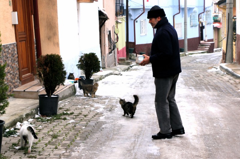 Eskişehir'de oturan emekli Aydın Işık, 4 yıldır her gün sabah ezanın ardından evinin bulunduğu sokakta 60 kediyi besliyor, evinin bahçesinin bir bölümünde onlar için yaptırdığı iki odalı barınakta soğuktan koruyor.