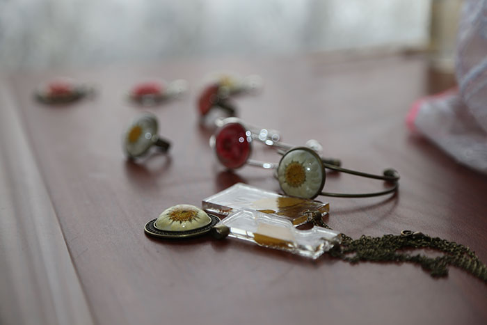 Eskişehir'de, KPSS'de yeterli puanı alamadığı için atanamayan öğretmen adayı, kuruttuğu çiçeklerden reçine kullanarak kolye, yüzük ve bileklik gibi takılar tasarlamaya başladı.