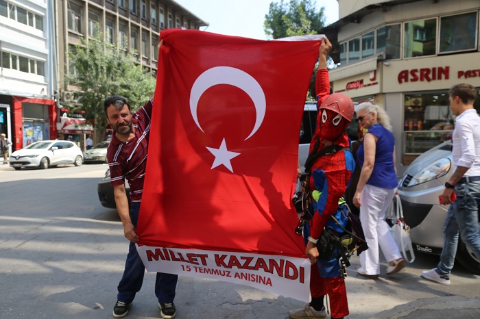 Çizgi roman ve film kahramanı "Örümcek Adam" kostümüyle 4 yıldır profesyonel olarak dış cephe cam temizliği yapan Eskişehirli dağcı, bir plazanın camlarını silerken "Zafer Milletindir-15 Temmuz Anısına" yazılı pankart açtı.