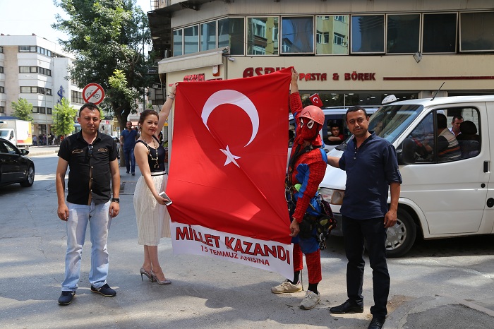 Çizgi roman ve film kahramanı "Örümcek Adam" kostümüyle 4 yıldır profesyonel olarak dış cephe cam temizliği yapan Eskişehirli dağcı, bir plazanın camlarını silerken "Zafer Milletindir-15 Temmuz Anısına" yazılı pankart açtı.