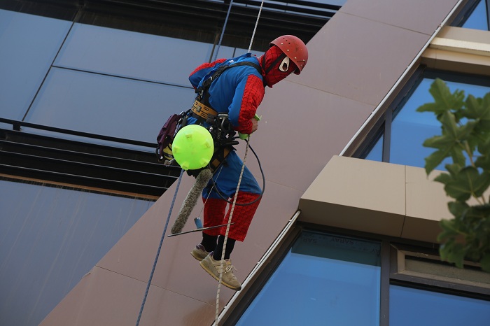 Çizgi roman ve film kahramanı "Örümcek Adam" kostümüyle 4 yıldır profesyonel olarak dış cephe cam temizliği yapan Eskişehirli dağcı, bir plazanın camlarını silerken "Zafer Milletindir-15 Temmuz Anısına" yazılı pankart açtı.