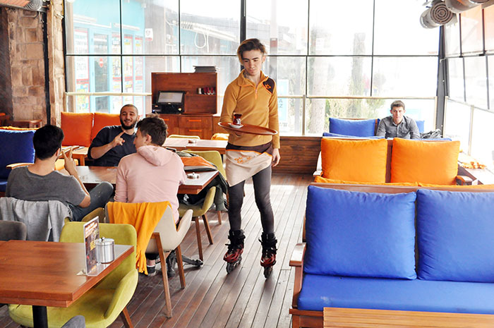Eskişehir’de bir kafede, hem müşterilere daha hızlı servis yapabilmek hem de kafe içerisinde farklılık oluşturmak adına patenli garson eşliğinde servis yapılıyor. Kafede sıcak ve soğuk servisleri yapan patenli garsonu gören insanlar ise olanları şaşkınlıkla seyrediyor.