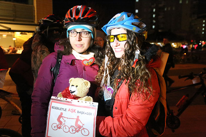 Eskişehir'de bir alışveriş merkezinin önünde buluşan çoğu bisikletli vatandaşlar, "14 Şubat Sevgililer Günü" dolayısıyla birbirlerine hediye almak yerine "Bisiklet aşktır. Aşıksan bas pedala" sloganıyla pedal çevirdi.