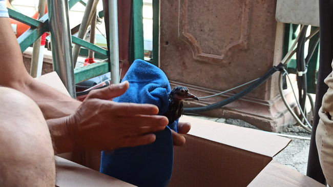 Çalışanlar, kısa bir süre hareketsiz kaldığı için hayati riskinin olduğunu tahmin ettikleri kuşu, hızlı bir şekilde kıyıya çıkardı. Karada yavaş yavaş kendine gelen kuş, bir karton kutuya alınıp muhafaza edildi.