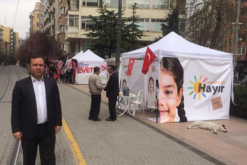 Sandığa sayılı günler kala evet çadırları görüldü. Seçime renk gelmişti. Daha doğrusu seçime gittiğimiz belli olmuştu! Hemen ardından İzmir Marşı’nın yükseldiği hayır çadırları görüldü. Eski Kılıçoğlu Sineması’nın karşısında evet ve hayır çadırları yan yana kuruldu.