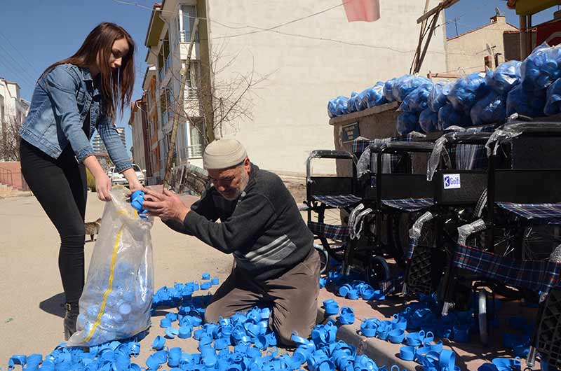 Eskişehir’de 10 yıldır topladıkları mavi kapak ile engelli vatandaşlara umut ışığı olmaya devam eden 71 yaşındaki Halit Aydoğan ve torunu Melike Sarıtaş, şimdiye kadar 88 tekerlekli sandalye aldı.
