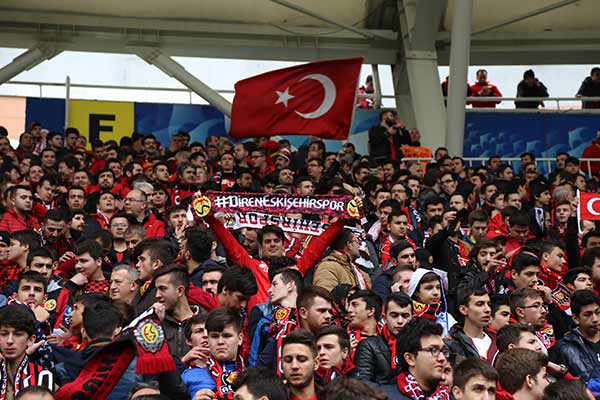 Tribünlerde yaptıkları görsel şovlarla Türk futbolseverlerin beğenisini kazanan Eskişehirspor taraftarının sazlı sözlü son deplasman yolculuğu AA tarafından görüntülendi.