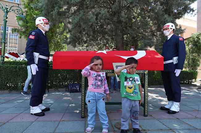 Burada tabutun önüne geçen küçük Nisa, babasının naaşının önünde bir akrabasının oğlu ile birlikte asker selamı vererek son yolculuğuna uğurladı.