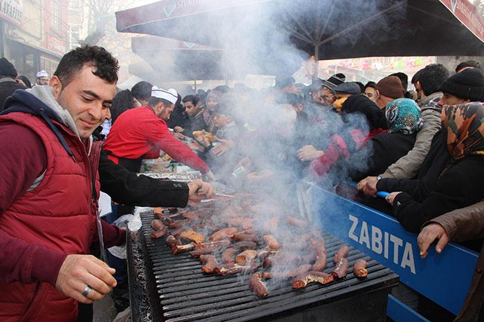 Eskişehir'in Sivrihisar ilçesinde düzenlenen 'Meşhur Sivrihisar Dövme Sucuk Festivali'nde yaklaşık 2 ton pişmiş sucuk dağıtıldı. Yaklaşık 10 bin kişinin katıldığı festivalde vatandaşlar, ücretsiz dağıtılan sucuklardan alabilmek için uzun kuyruklar oluşturdu.