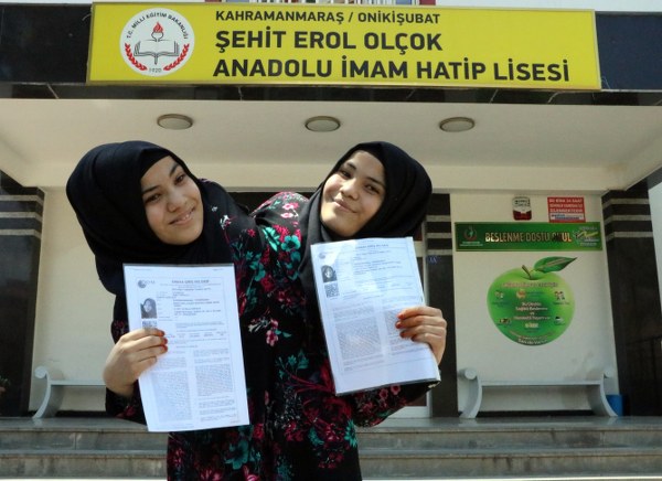 Kahramanmaraş’ın Türkoğlu ilçesinde yaşayan Ayşe Tanrıkulu ve Sema Tanrıkulu (18) kardeşler merkez Onikişubat ilçesindeki Şehit Erol Olçok Anadolu İmam Hatip Lisesi’nde Temel Yeterlilik Sınavı’nda (TYT) birlikte ter döktü. Sınav sonrası Ayşe ve Sema Tanrıkulu, okul idareci ve öğretmenleri tarafından ilgi odağı oldu.