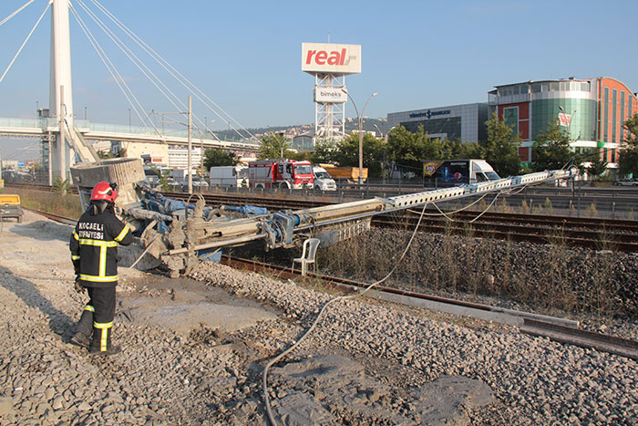 Kocaeli'nin İzmit ilçesinde tren yolu inşaatında çalışan sondaj makinesi tren yoluna devrildi. Kazada enerji nakil hatlarının kesmesi nedeniyle Ankara-İzmit arası tüm tren seferleri durduruldu.