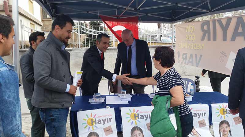 CHP İl Başkanı Sinan Özkar ve Odunpazarı Belediye Başkanı Kazım Kurt ile birlikte, halkı bilgilendirmek adına açılan hayır stantlarını gezen Eskişehir Milletvekili Cemal Okan Yüksel; Özkar ve Kurt ile birlikte Taşbaşı’ndaki evet standını da ziyaret etti.