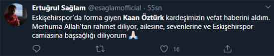 Eskişehirspor U-19 takımında forma giyen genç oyuncu Kaan Öztürk, dün akşam geçirdiği trafik kazası sonrasında yaşamını yitirdi. Eskişehir ve Eskişehirspor'u yasa boğan bu ölüm haberinin ardından spor camiası sosyal medyadan taziyelerini böyle paylaştı...