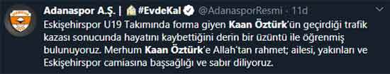 Eskişehirspor U-19 takımında forma giyen genç oyuncu Kaan Öztürk, dün akşam geçirdiği trafik kazası sonrasında yaşamını yitirdi. Eskişehir ve Eskişehirspor'u yasa boğan bu ölüm haberinin ardından spor camiası sosyal medyadan taziyelerini böyle paylaştı...