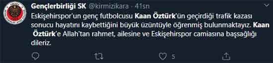Eskişehirspor U-19 takımında forma giyen genç oyuncu Kaan Öztürk, dün akşam geçirdiği trafik kazası sonrasında yaşamını yitirdi. Eskişehir ve Eskişehirspor'u yasa boğan bu ölüm haberinin ardından spor camiası sosyal medyadan taziyelerini böyle paylaştı...