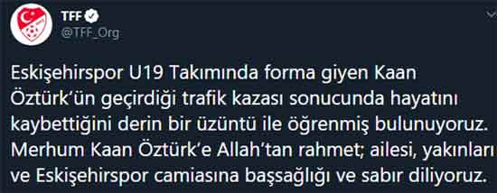 Eskişehirspor U-19 takımında forma giyen genç oyuncu Kaan Öztürk, dün akşam geçirdiği trafik kazası sonrasında yaşamını yitirdi. Eskişehir ve Eskişehirspor'u yasa boğan bu ölüm haberinin ardından spor camiası sosyal medyadan taziyelerini böyle paylaştı...