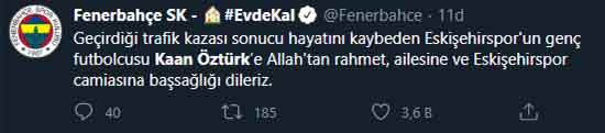 Eskişehirspor U-19 takımında forma giyen genç oyuncu Kaan Öztürk, dün akşam geçirdiği trafik kazası sonrasında yaşamını yitirdi. Eskişehir ve Eskişehirspor'u yasa boğan bu ölüm haberinin ardından spor camiası sosyal medyadan taziyelerini böyle paylaştı...