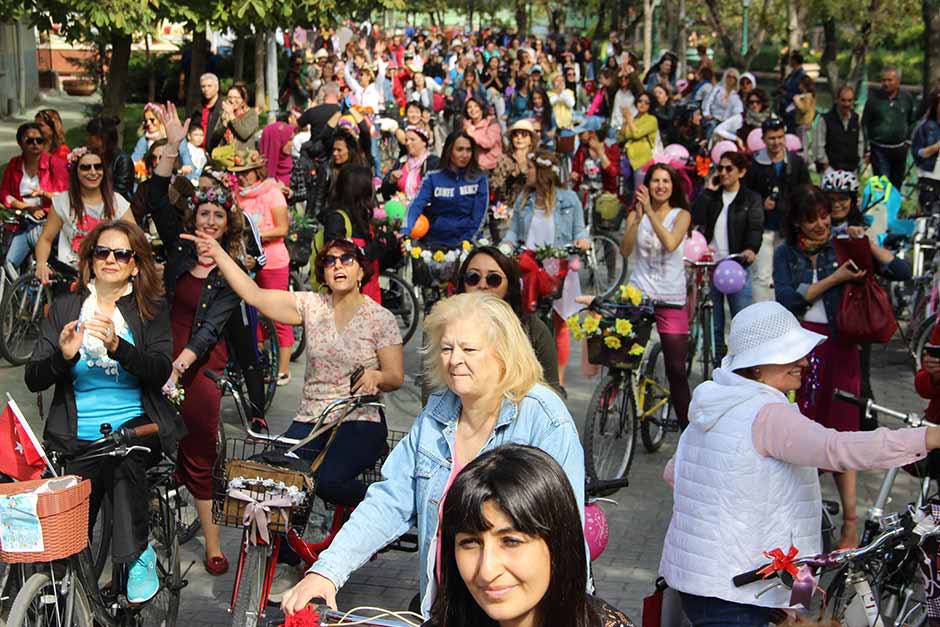 Eskişehir’de rengarenk giyinip kendileriyle beraber bisikletlerini de süsleyen bir grup kadın, Dünya Otomobilsiz Kentler Günü dolayısıyla kentte bisiklet turu düzenledi.