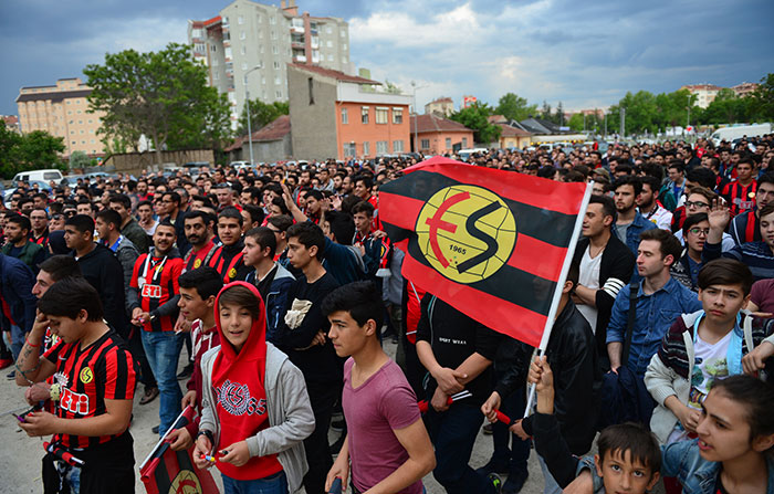 Eskişehirspor taraftarı, siyah-kırmızılı takımın TFF 1. Lig play-off yarı final ilk maçında Giresunspor ile deplasmanda 3-3 berabere kaldığı karşılaşmayı dev ekranlardan izledi.