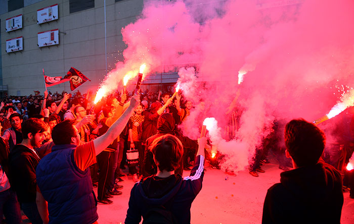 Eskişehirspor taraftarı, siyah-kırmızılı takımın TFF 1. Lig play-off yarı final ilk maçında Giresunspor ile deplasmanda 3-3 berabere kaldığı karşılaşmayı dev ekranlardan izledi.