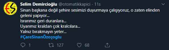 Siyah Kırmızılı taraftarlar Twitter hesaplarından #ÇareSinanÖzeçoğlu etiketiyle kampanya başlatarak, hazırladıkları pankartları da şehrin çeşitli bölgelerine astılar.