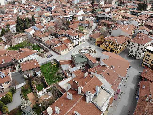 Eskişehir’de hafta sonu uygulanan sokağa çıkma kısıtlamasında sokakları bomboş kalan tarihi Odunpazarı bölgesi drone ile havadan görüntülendi.