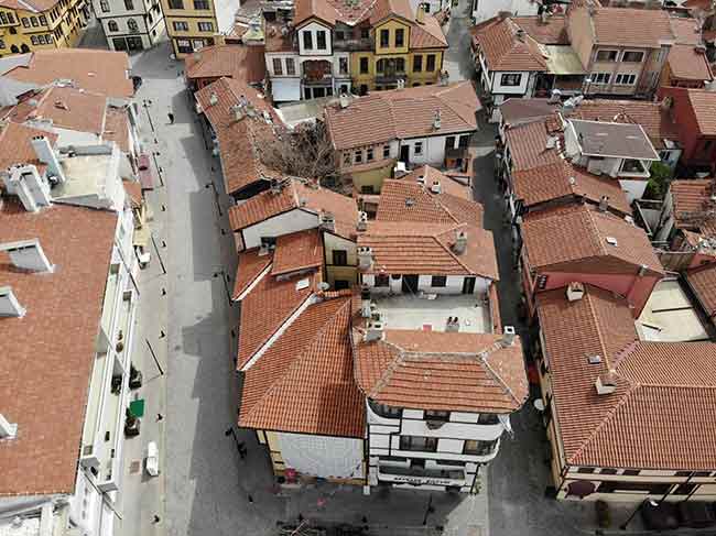 Eskişehir’de hafta sonu uygulanan sokağa çıkma kısıtlamasında sokakları bomboş kalan tarihi Odunpazarı bölgesi drone ile havadan görüntülendi.