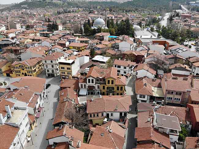 Eskişehir’de hafta sonu uygulanan sokağa çıkma kısıtlamasında sokakları bomboş kalan tarihi Odunpazarı bölgesi drone ile havadan görüntülendi.