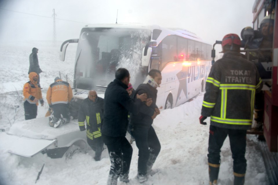Tokat'ta bir otobüsün çarptığı otomobildeki bir kişi hayatını kaybetti, 2 kişi de yaralandı.