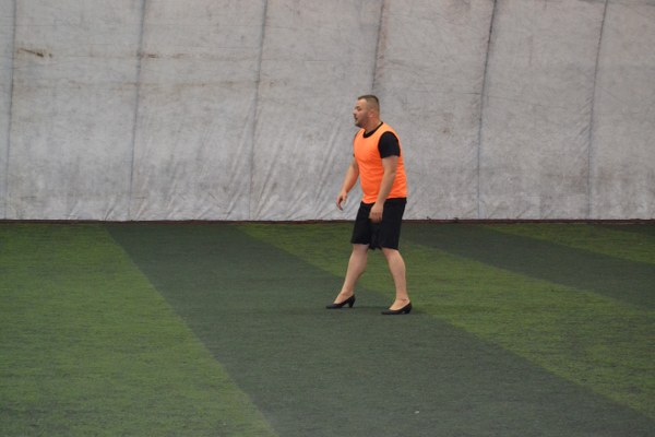 Topuklu ayakkabı giyen erkekler kadın futbolcularla maç yaptı