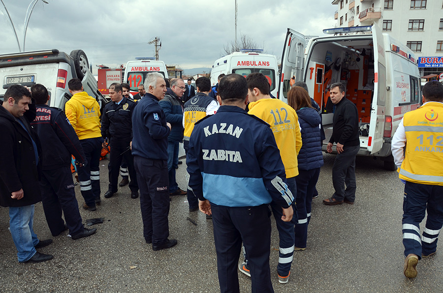 Ankara'nın Kazan ilçesinde hafif ticari araç ile ticari taksinin çarpışması sonucu 2'si çocuk 8 kişi yaralandı.